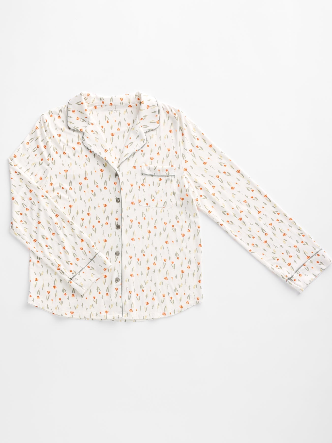 A woman in the HIDE Women's Bamboo Stretch-Knit Long Sleeve Pajama Top, light gray with white piping and buttons, stands against a plain background, softly smiling as she gently holds the top near her chest. |Color:Grey